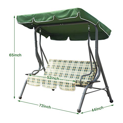 Patio swing is made of steel frame with protective powder-coated finish, overall dimension: 72 x 44 x 65in. Seat Dimension: 52 x 20 x 20 inch. and 3 in. thick, ensures large weight capacity (approx: 600lbs).