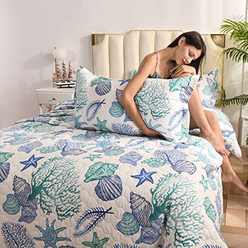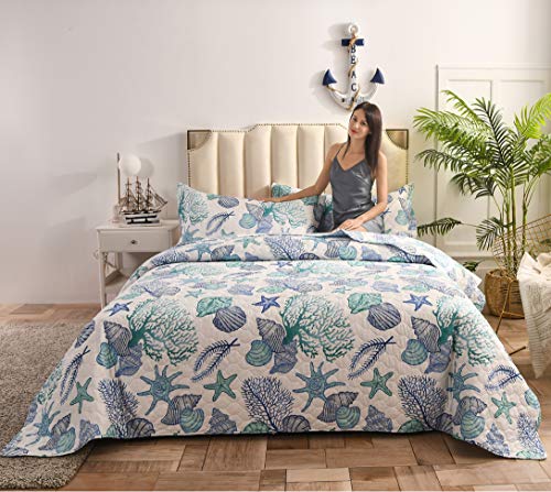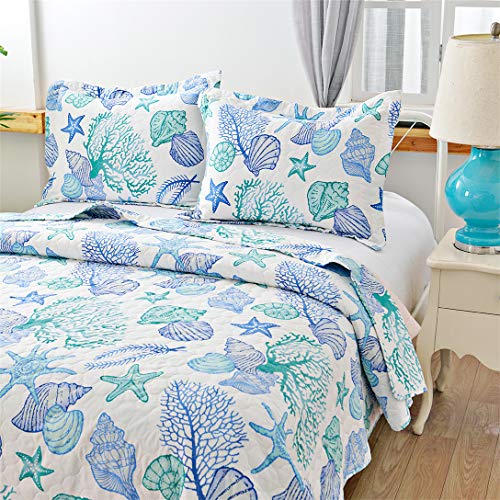 Reversible Coverlet Set:Blue ocean creature design coverlet set,seashell conch starfish printed bedspread,the same design on both side,makes the quilt set looks stylish and beautiful,perfect gifts for kids/boys/girls/teens/adults bedroom or guest room decor.
