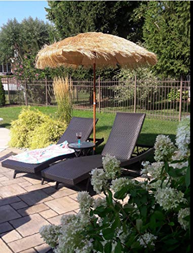 The steel frame imitates the natural look of wood and features Eco-friendly PE thatch polyester fabric