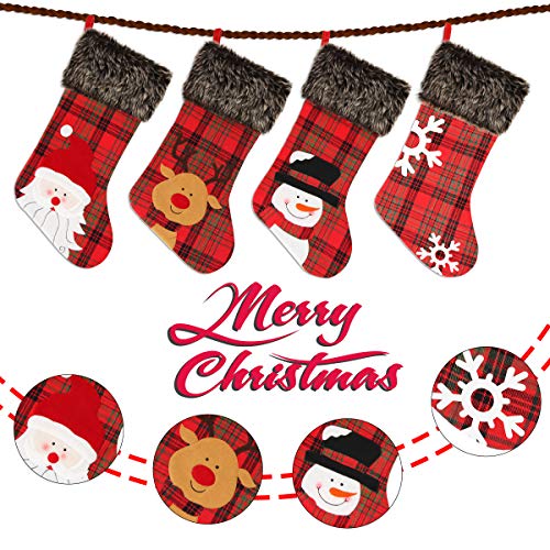 Original Design: Great value 4 pack Xmas stockings with Snowflake, Santa, Snowman and Reindeer. Put carefully selected gifts for the family and children. They are going to look great when hanging to Christmas tree. Perfect decoration for Christmas, New Year at home, restaurant, club, bar.