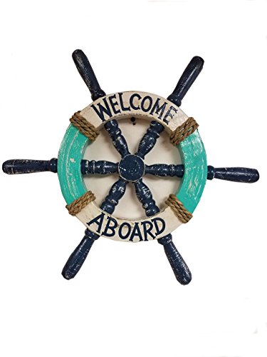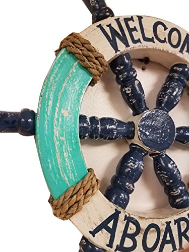 HANDCARVED & PAINTED WOOD SEA AQUA GREEN, WHITE, & BLUE DISTRESSED STYLE SHIPS WHEEL WITH BAMBOO ROPE ACCENTS & WALL HANGER ON THE BACK OF ITEM.
