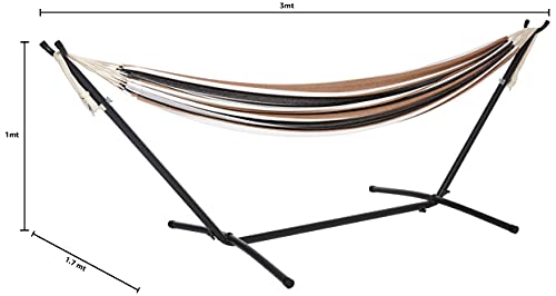 Includes double hammock, nine’ house-saving heavy duty steel stand, and sporting case