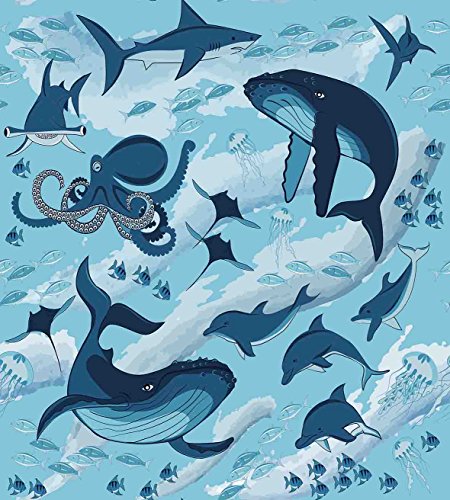 Ambesonne Shark Duvet Cover Set, Inhabitants of Ocean Sharks Whales Dolphins Octopus Jellyfish Starfish with Waves Image…