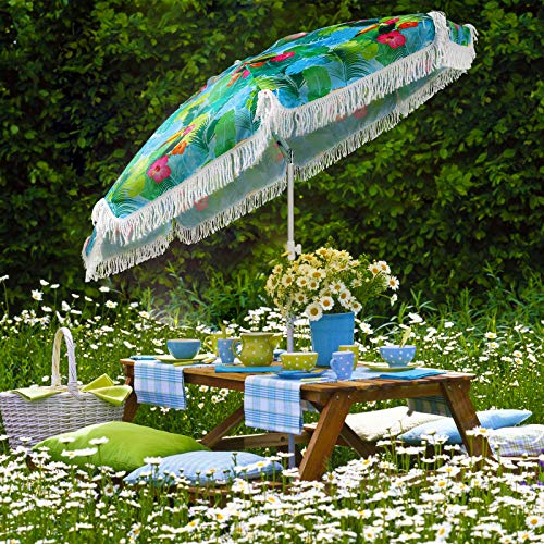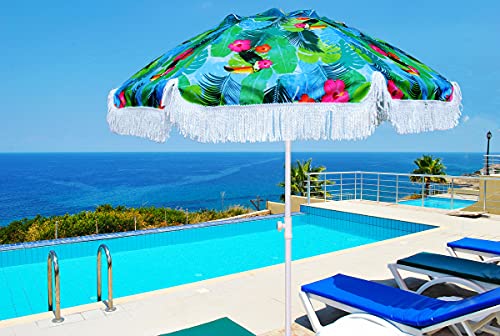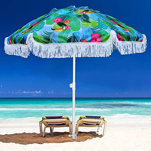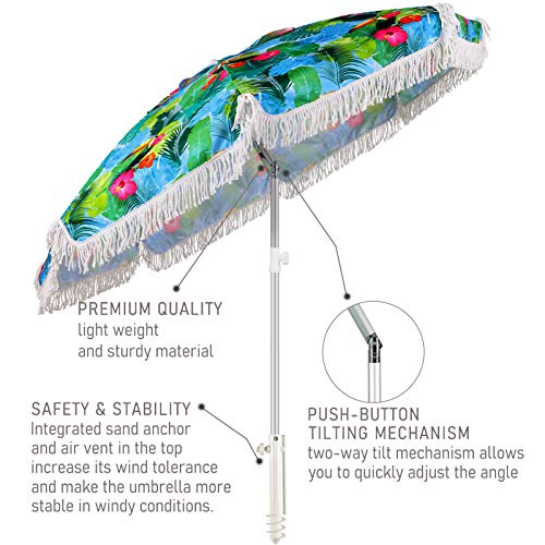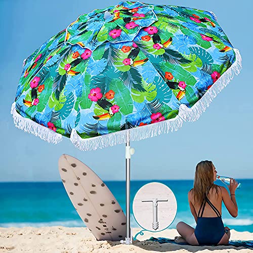 ☀️PUSH BUTTON TILT&AIR VENT DESIGN: The ammsun beach umbrella features a two-way tilting mechanism that allows you to adjust the shade and block the sun quickly without moving the beach umbrella, you can enjoy cool shade from sunrise to sunset.AMMSUN beach umbrella elegant and unique Tropical bird pattern design. air-vent designed to facilitate air flow for more stability.