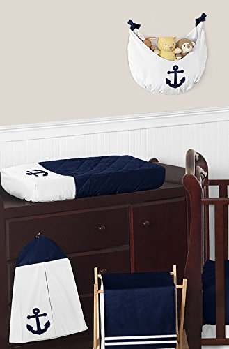 Anchors Away 11 Piece Crib Bedding Set has all that your little bundle of joy will need. Let the little one in your house settle down to sleep on this implausible nursery set. This baby boy bedding set features traditional anchor appliques with navy blue accent trims on crisp white cotton. This collection uses the trendy colors of navy blue and white. The design uses 100% cotton fabrics which can be machine washable for simple care. This excellent set will fit all cribs and toddler beds. Crib set includes: Crib Comforter, Fitted Sheet, Crib Skirt (Dust Ruffle), Diaper Stacker, Toy Bag, Decorative Pillow, Set of 3 Wall Hangings and 2 Window Valances.