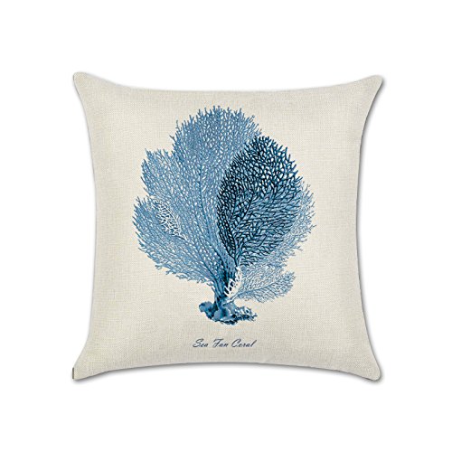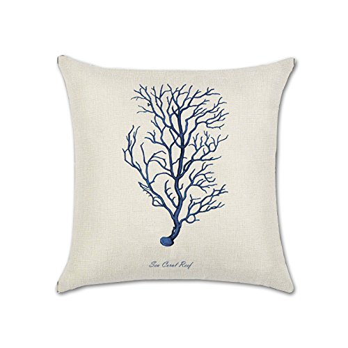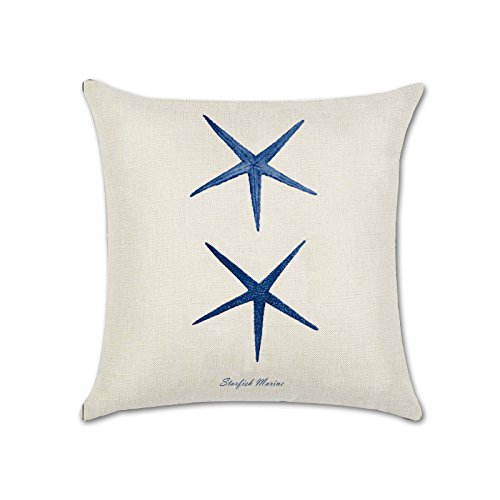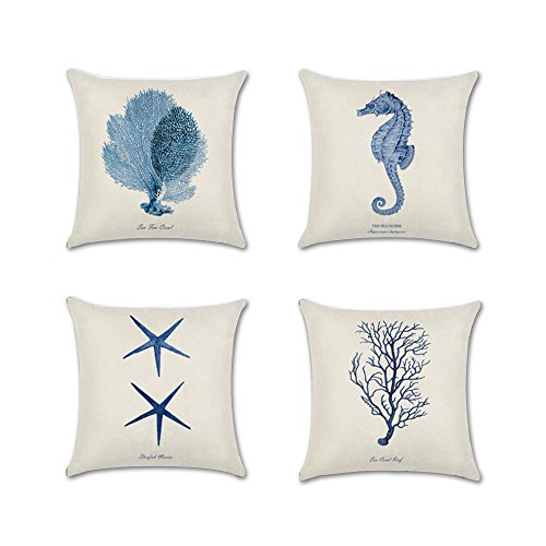 Baby Plum Ocean Park Cotton Linen Theme Decorative Pillow Cover 18″ X 18″ Square Shape Ocean Beach Sea Print Starfish Seahorse Voyage Pillowcases for Home Decoration, 4 Pack (Blue)