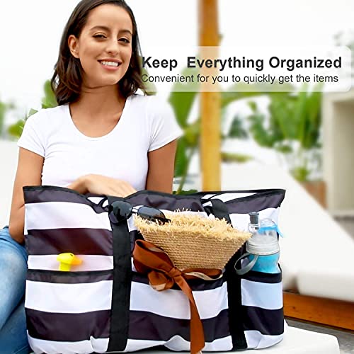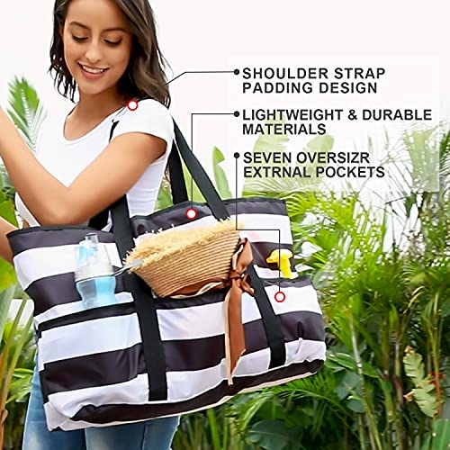 Black White Stripes Pattern Tote Beach Bag: The large tote with black and white stripes, reflecting your elegance, fashion and simplicity. This tote bag for women with zipper is suitable for you and your Circle of relatives to go to the beach for a holiday and enjoy a good holiday together.