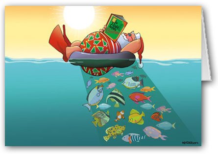 Santa in ocean floating on raft Christmas cards. Inside of Card: Have a gorgeous vacation season. Amount: 18 boxed Christmas cards and white envelopes. Measurement: 5×7 folded cards. Shiny end on entrance and matte interior