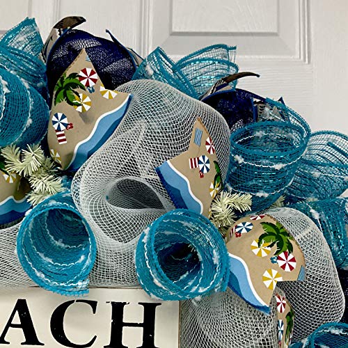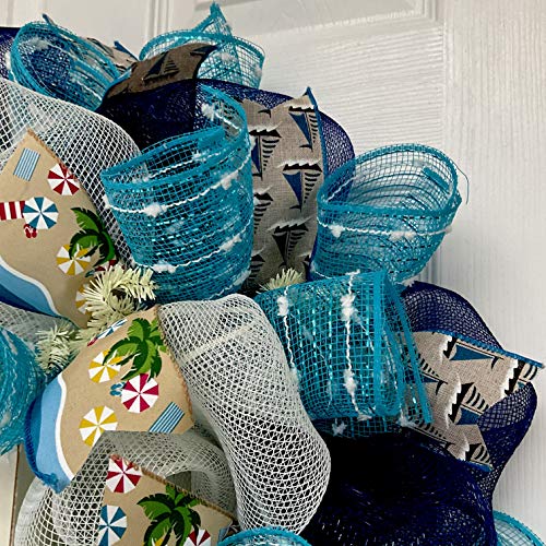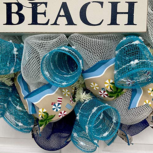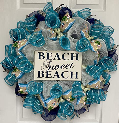 New, Full, Premium, massive, hand-crafted deco mesh beach welcome wreath. A big, wooden sign with the wording “Beach Sweet Beach” rests on a bed of cream deco mesh. Shimmering turquoise flutes with white cotton dots and stripes, in conjunction with adorable beach ribbons surround the accessory. The outer ring is fabricated from navy blue deco mesh. The similar turquoise flutes in conjunction with burlap sail boat ribbons surround the outside. The wreath measures 24 inches in diameter and 6 inches deep. Absolute best for lake, beach and summer homes.