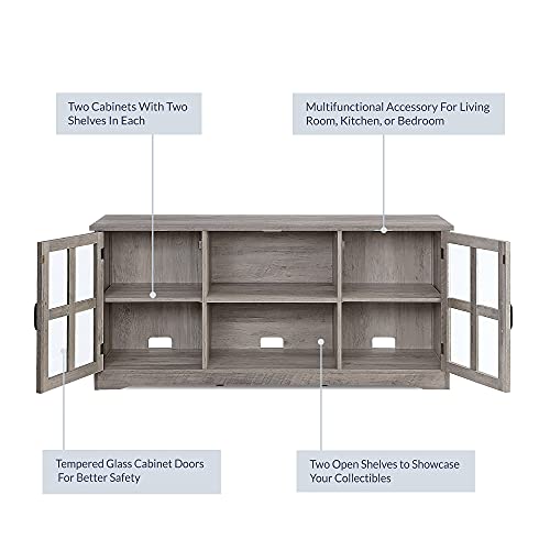 [STYLISH GLASS DOORS] Windowpane-style tempered glass cabinet doors give this entertainment center a decorative touch while enhancing safety.