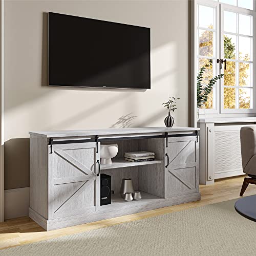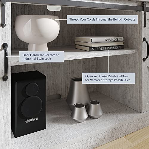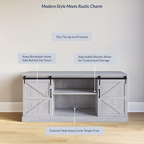 [MODERN FARMHOUSE DESIGN] Harnesses country design elements with a modern spin. This TV stand blends farmhouse decor with an industrial touch. Barn-style doors lend an added aesthetic.[SPACIOUS STORAGE] The top shelf fits up to a 65-inch TV. Adjustable shelves and enclosed cabinets can hold electronics, audio/visual accessories, home entertainment systems, and decor.