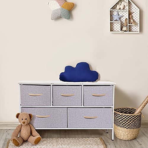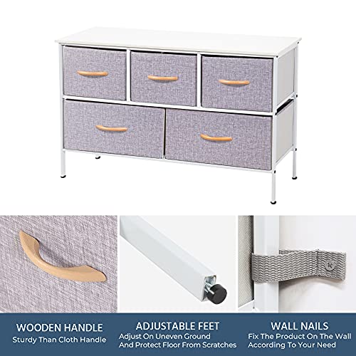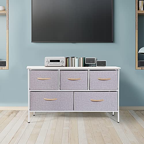 BizHomart Wide Dresser with 5 Drawers, Dressers for Bedroom, Fabric Storage Tower, Bedroom, Living Room, Hallway, Closets, Nursery, Sturdy Steel Frame, Wood Top, Easy Pull Care for, Light Gray/White