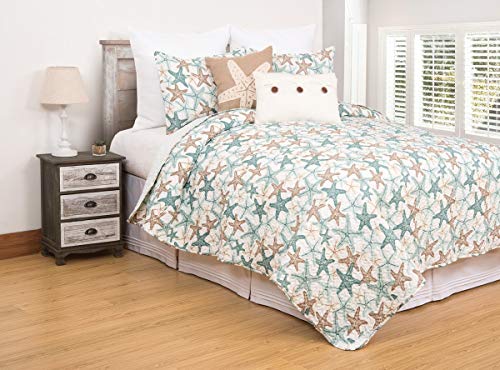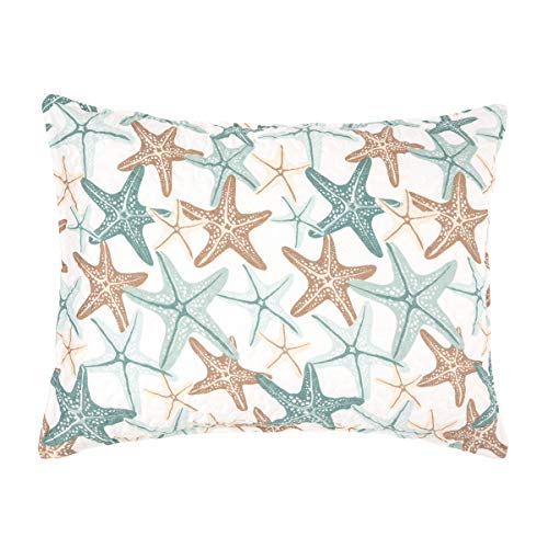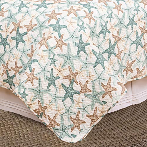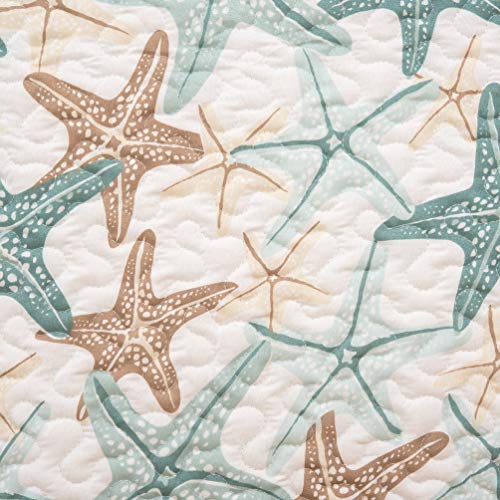 UNIQUE DESIGN: All over print bedding in tones of beige and teal starfish on a white ground.