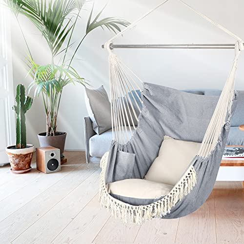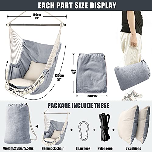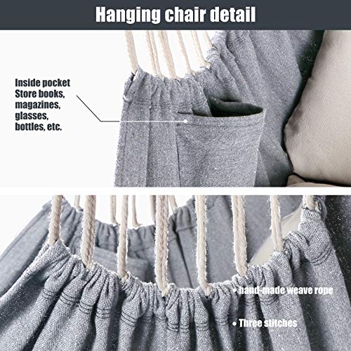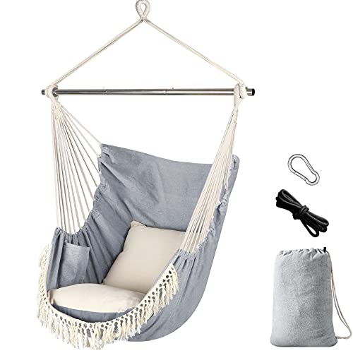 Extra Bonuses & Additions.There’s a great 10” x 8” inch pocket on the inside providing the perfect space for your book,TV remote, glasses or your chocolate stash.The large 2 cushions,17.7” x 17.7” will give you extra improve.The chair is enhanced by the beautiful macrame trim,looks amazing.A drawstring bag to store and portable.A hook and a rope for hanging,it is easy to set up.This is the best hanging chair for bedrooms and outdoors.