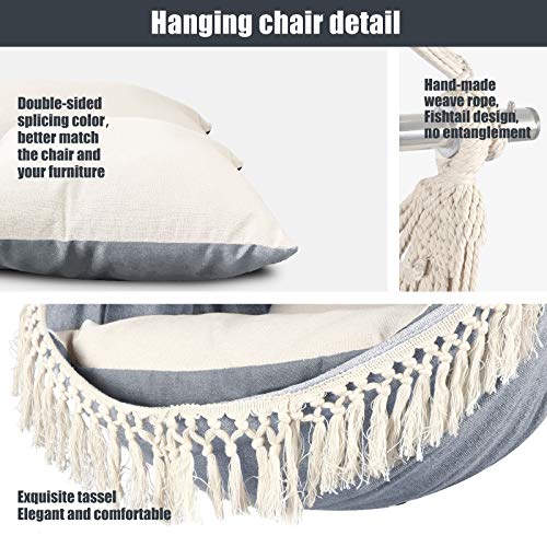 【Package Contents】1 x top hanging loop,1 x cloth chair seat with chic tassels,1 x metal spreader bar(3 pieces metal pipes,you wish to have to assemble them,easily to get it)1x Iron snap hook,1 x rope,2 x cushions, 1 x drawstring bag