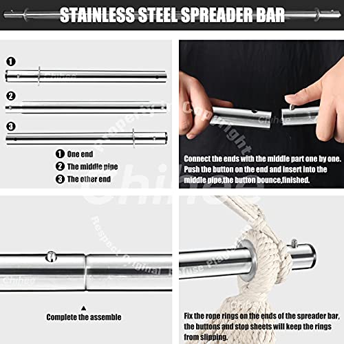 Greatly Strength and durability.Equipped with a sturdy metal rod,with instead of the wood rod,completely saying goodbye to the worry about the firmness of the spreader bar.3-section deattacable stainless steel spreader bar.There are barrier sheets and buttons to catch the rope and prevent slipping.26 hanging cords on each side of the chair to distribute weight and keep balance.The cotton-blend chair cloth increases the load-bearing capacity and the wear resistance of the fabric.