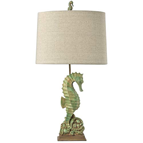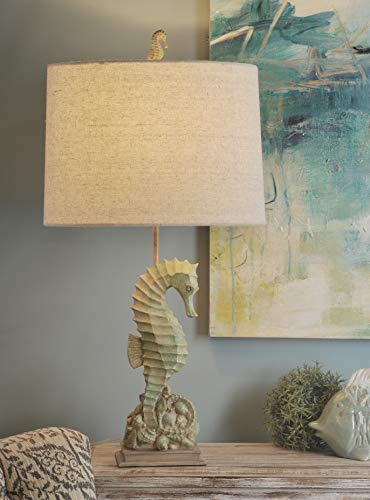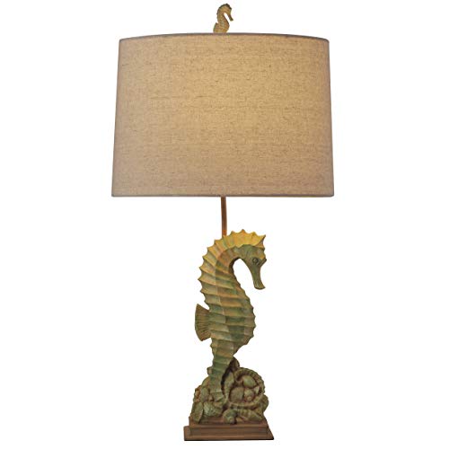 Complete your costal oasis with this poly table lamp. The seahorse design is perfect if you wish to add some fun to your abode. Be a focus for your guests by placing this lamp in your entryway or guest room. This lamp features a rotary 3-way switch on the neck of the lamp This item is rated for dry locations, meaning it may be used in an indoor area that may be not typically subject to dampness. May include a location subject to temporary dampness provided ventilation is adequate to prevent any accumulation of moisture such as the toilet This product is manufactured in China