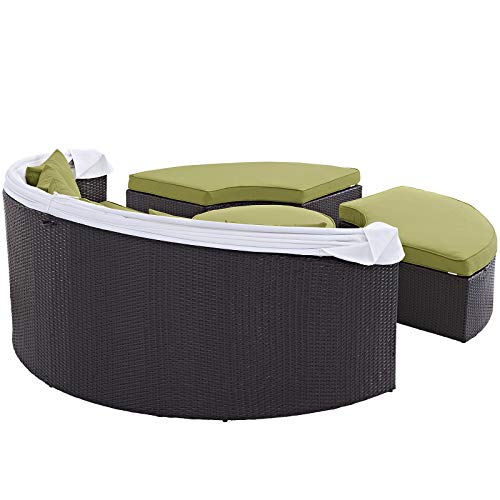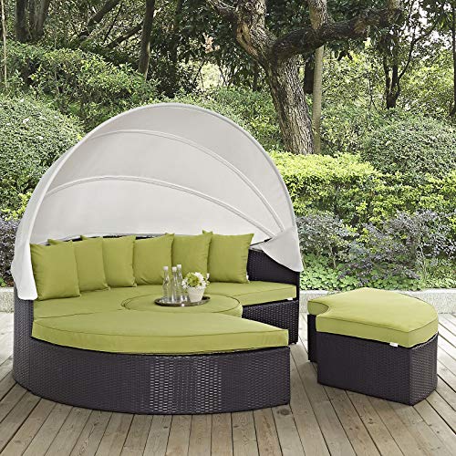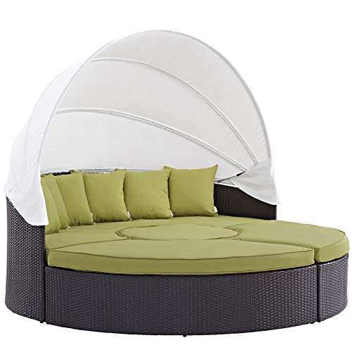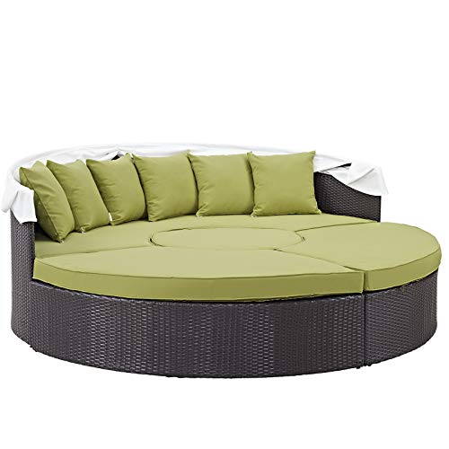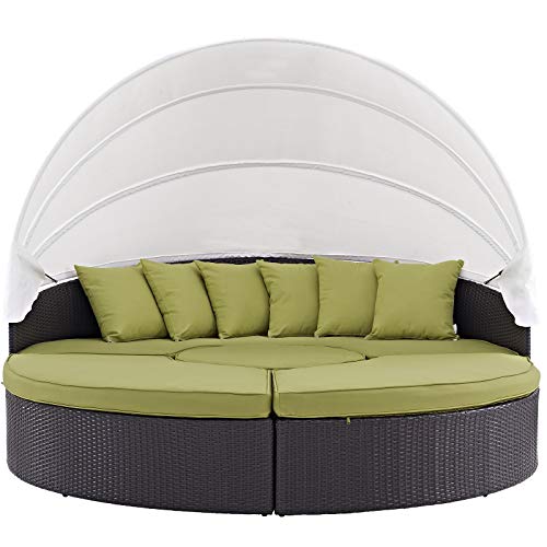 Set Includes: One – Quest Circular Outside Patio Quarter Coffee Table, One – Quest Circular Patio Daybed with Canopy, Six – Quest Throw Pillows, Two – Quest Circular Outside Patio Quarter Ottomans