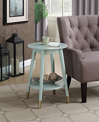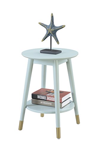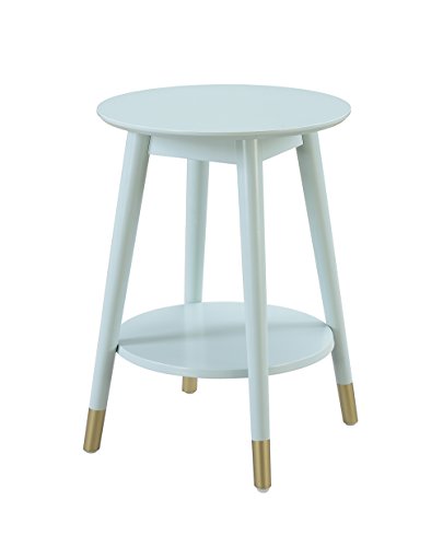 Make a statement in your home with the Wilson Mid Century Round End Table with Shelf by Convenience Concepts. This stylish round table has much versatility and can be used in the living room, family room, or home office. Featuring a spacious tabletop and a bottom shelf that both offer plenty of display space. The flared mid-century styled tapered legs are built from solid rubberwood and create a fun yet modern look. The bottom of the legs is also dipped in a sleek gold non-lead-based paint that adds a bold contrast. Look for other items from the Savannah Mid Century Collection by Convenience Concepts, each sold separately.