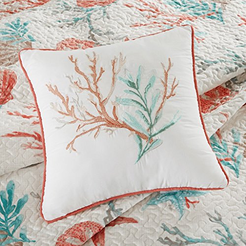 For a coastal update to your space, this Quilt Set is perfect for you! Printed on 210 thread count cotton, the rich coral and teal colors play into the starfish and coral motifs for a textured look adding color to your space. Three decorative pillows use embroidery and fabric manipulation adding dimension to your top of bed. The set includes: 1- King 104×94″ Size Quilt & 2- Pillow Shams & 3- Toss Pillows