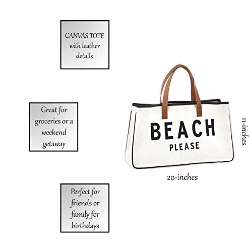 READS: Beach please, in black lettering on cream color canvas bag, brown leather handles and black border