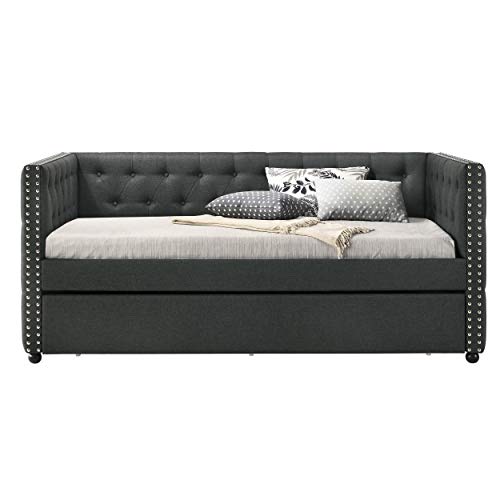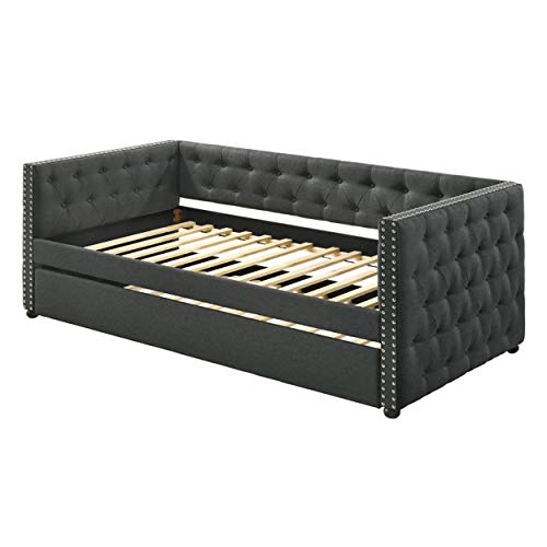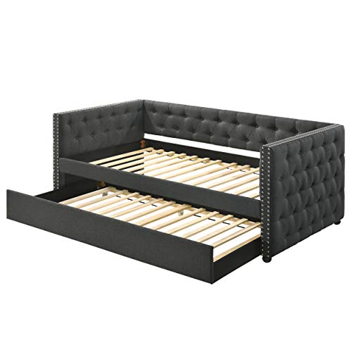 ♥ [ Upholstered Daybed ] – Sturdy rubber wood frame with upholstered fabric ensures strong support and stability. Weight capacity: Daybed: 400lbs; Trundle: 225lbs. Button tufting and nail-head trim accents give off the right amount of luxury and sophistication.