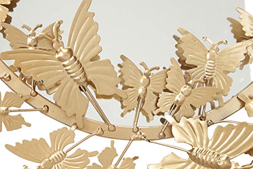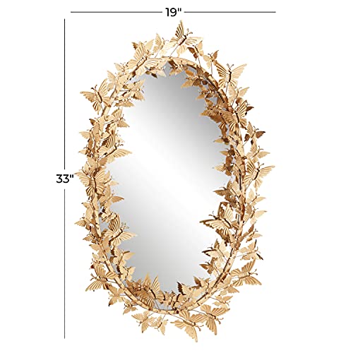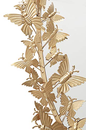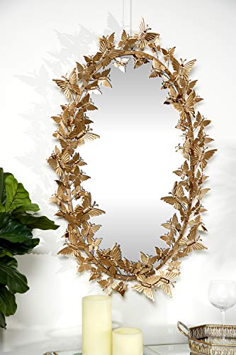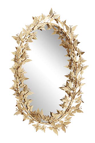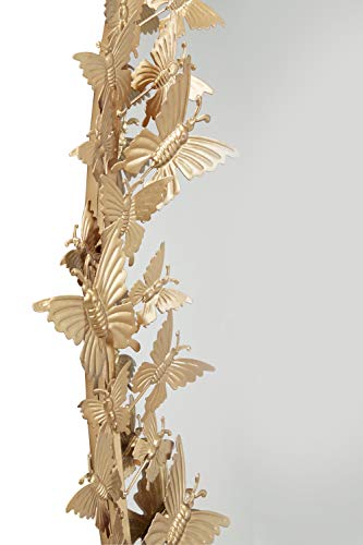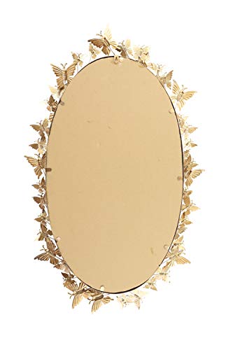 The vivacious and eccentric movement of layered gilded butterflies on this large, oval, metallic gold wall mirror will bring your room to life! The oval iron frame is jumping with metallic butterflies securely welded in more than a few sizes and instructions, and their gold powder coat finish reflects light superbly. This mirror in reality pops against an exceptional wall as immensely dimensional butterfly wall decor.