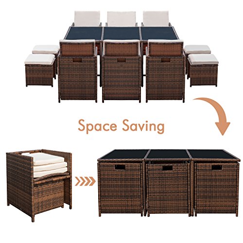 -Devoko 11 pieces patio dining sets including 1 table, 6 single chairs, 4 ottomans and 16 cushions. These zippered cushions fill with thick cotton giving you optimal comfort and relaxation