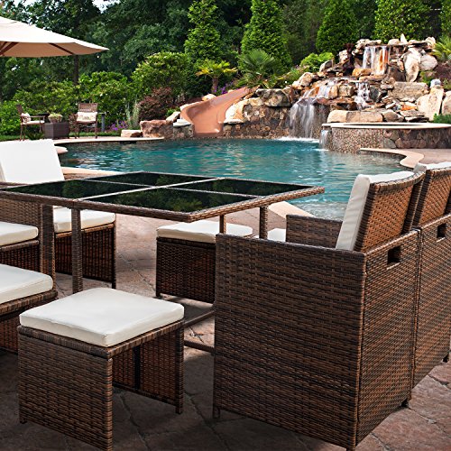 The design of 9 pieces patio dining sets will go well with any garden or backyard arrangement and landscaping. Fashionable rattan and modern design complements any space and the durable construction will make this piece a favorite of yours for summers to come, creating a beautiful and luxurious outdoor living space for you and your guests
