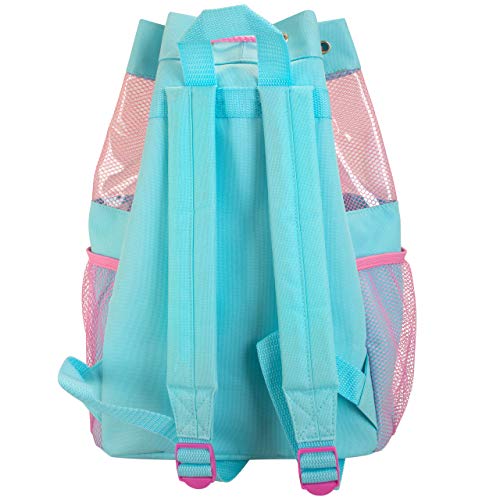 A drawstring main compartment and mesh side pockets make this Mermaz-ing swimming bag best possible for storing all their hidden treasures from under the ocean!