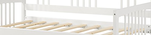 The Kayden Twin Daybed is a versatile piece of furniture that addresses both seating and sleeping needs. Featuring clean lines with a beautiful finish, this daybed will blend with a wide variety of décor options. You can use it plain or dress it up with decorative pillows for an added stylish touch. Its solid wood frame makes it sturdy and durable, while the wooden slat details add a classic touch. A box spring is not required because the daybed features strong wooden slats to ensure optimal mattress support (mattress sold separately). You can use this wooden daybed to provide extra sleeping accommodations for guests. It will work well in a guest room, den or in any small living space because of its compact size. The Kayden Twin Daybed can also accommodate a trundle (sold separately) or allow for extra storage space underneath to hideaway unused items and keep your space clutter-free.