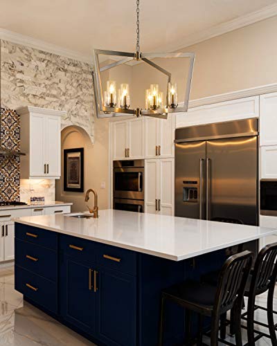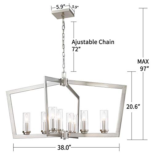 [Height Adjustable] This focal centerpiece is 38" in length X 38" in width X 20.6" in height, making its size perfect over your Kitchen Island and rectangular dining table. The canopy comes in 5.9" in length X 5.9" in width X 1" in height, designed to fully cover the standard size of the junction box. It comes with 72" height adjustable chains giving you the option of adjusting height between 97" to 22" from ceiling to bottom based on your need.