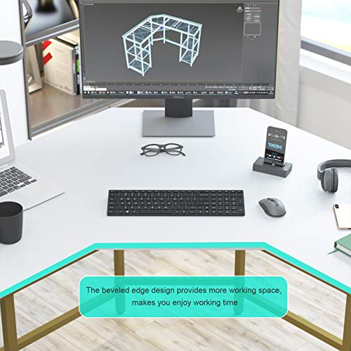 Spacious Workstation: (56.9+56.9)L x 21.6D x 29.5H inch, full L Shape design fits snugly in a corner to maximize your limited space. The beveled edge design in the middle provides more working space. It can maximize the daily working, gaming and reading enjoyment.