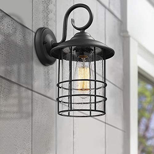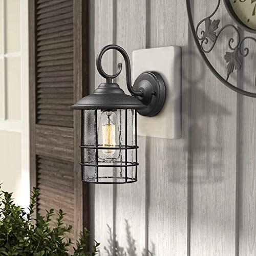 Weather resistant and suitable for wet locations, this exterior wall light features sturdy metal construction and seeded glass shade in black finish Easy installation with open bottom to allow for easy bulb replacement. Includes all mounting hardware Hard wired. Requires 1 x E26 base bulb(Max.100W). Bulb NOT included. Compatible with LED bulb, Incandescent or CFL bulb