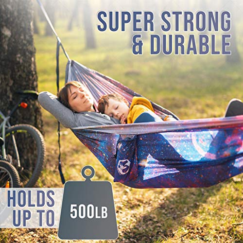 FIT FOR TWO: Two Person Foxelli Hammock (8.85’ long and 4.60’ wide) holds up to 500 lbs, so you can share it with your partner, kids or perhaps your whole family – all at the same time. Sharing is caring, so bring this double hammock along on your next camping or backpacking adventure and enjoy lounging in comfort – alone or with others – in the great outdoors.