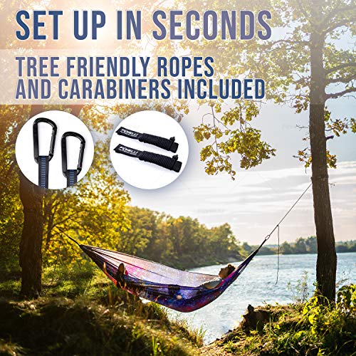 SETUP IN SECONDS: Spend less time setting up and more time hanging out! We ensure that our hammock is simple for anyone to setup, that’s why we made it super EASY TO ASSEMBLE — done in seconds without any tools, also lightweight and easy to pack without any special rolling/packing techniques. Comes packaged with ALL ACCESSORIES you need, including its own bag containing a set of tree friendly ropes with supports and carabiners. Just throw it in a backpack and take anywhere!