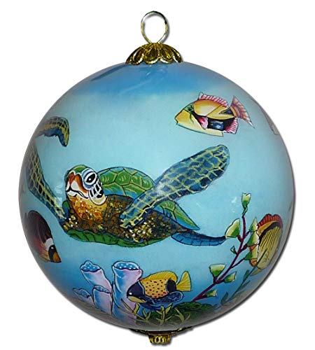 This collectible glass Christmas ornament features colorful underwater scenes with sea turtles and tropical fish.