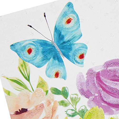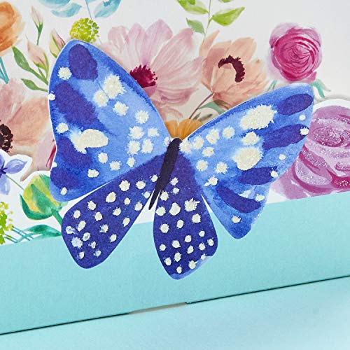 Cover includes a pretty painted scene of a Butterfly and flowers, accented with sparkly glitter. Open the card for a 3D pop up surprise.