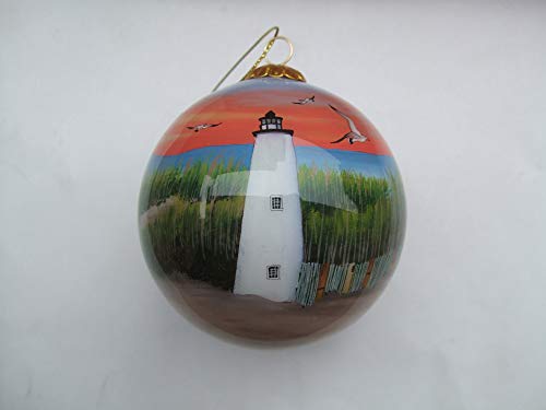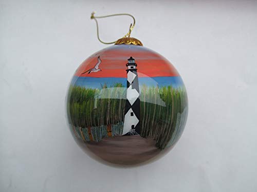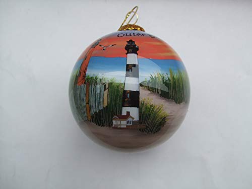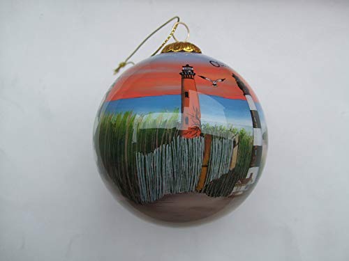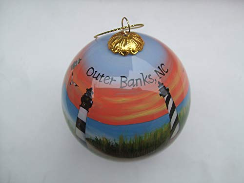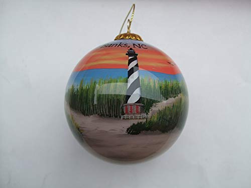 Outer Banks like you’ve never seen it before. This beautiful, reverse-painted glass ornament shows the lighthouse scene in full 360 degrees. It continues an ancient art-form prized by collectors. The artists choosing from a selection of miniature curved and bent-shafted brushes, painstakingly hand paints each minute detail on the inside of the ornament. The craft requires the artists to again and again insert the brush through the small opening in the sphere; first to outline the design, and then to detail the colors separately. All of the process for Each and every ornament requires up to two days. No two pieces are identical, making this inside-painted glass ornament a keepsake to be treasured from generation to generation.