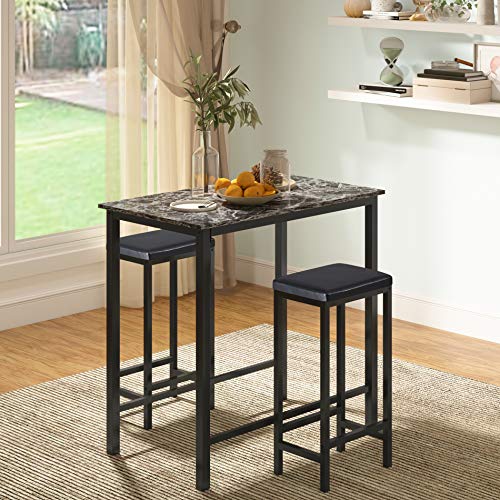 √ 3 piece pub set includes 1 table(Faux Marble Table Top)and 2 stools(Faux Leather Black Upholstered Stools).