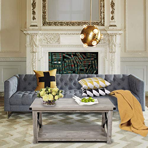 Invite the farmhouse coffee table to change a look of your home so that you don’t have to worry about there is not any fancy piece to serve drinks and snacks you probably have your friends around. Constructed of weathered particle board and metal X frame on both sides, this rustic coffee table blends nicely to suit your farmhouse aesthetic, which allows the laminate table top to display your home decor favorites whilst the bottom shelf for books, magazines or throws.