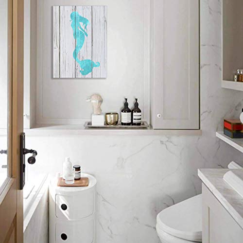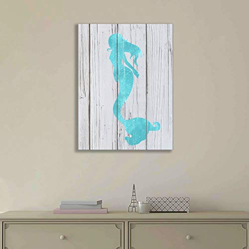 Detail of the jellyfish and mermaid wall art: there art paintings which rustic beige wood boards were used as the background, teal minimalist jellyfish and mermaid painted on the two plank one after the other. The paintings printed on canvas, and wrap on pine frame carefully.