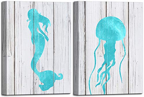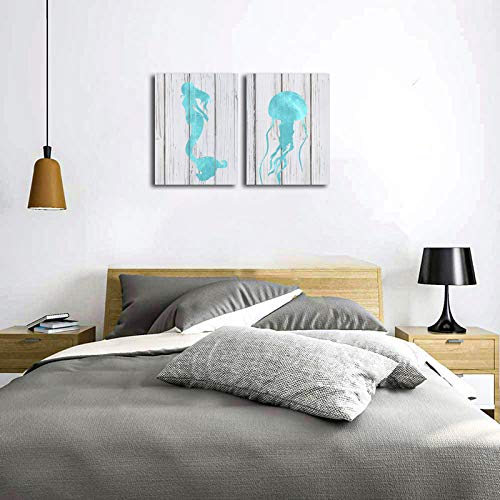 Jellyfish and Mermaid Decor Size: 30×40cm×2pcs / 12×16 Inches×2Pieces, well stretched on a 2cm thick wood frame, secure with polyester bag and packed with carton.