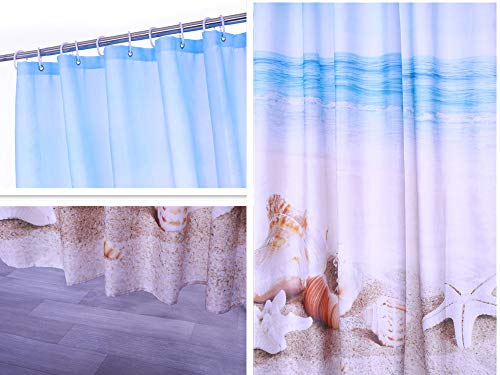 [Perfect Decoration for Bathroom]: This shower curtain ocean beach combines the romantic and beautiful elements of the beach, it includes the sea waves, starfish, seashel, conch and sand. This ocean starfish shower curtains brings the sea world romantic feel into your bathroom. The designed and classical colors in the curtains are coordinated with any style and any color of bathroom.