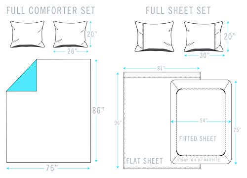 - Full: 1 – 76” x 86” Comforter, 2 – 20” x 26” Shams, 1 – 81″ x 96″ Flat sheet, 1 – 54″ x 75″ Fitted sheet, 2 – 20″ x 30″ Pillowcases