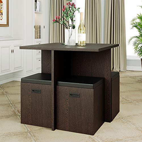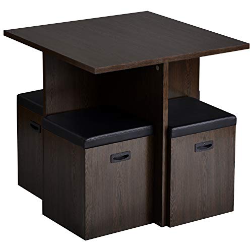[Space-saving Design]: Ottomans can’t be hidden completely under the table. The compact design with table and ottomans is suitable for four. Four ottomans can be tucked away under the table when not in use, perfect space-saving solution for small kitchens or dining rooms while retaining the same classy appeal as table. Table dimensions: 31″L x 31″W x 29.8″H; Chair dimensions: 14″L x 14″W x 17.5″H