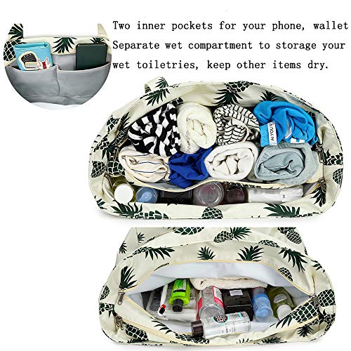 Separate wet compartment: Unlike other beach tote bag, this one is up-graded with separate waterproof wet compartment which you’ll be able to put into some wet stuff Toiletries, wet swimsuit and towels, keep other items dry all of the day.