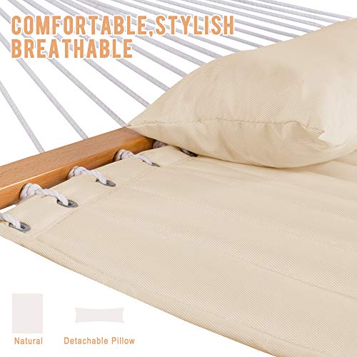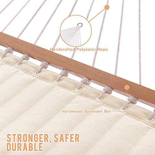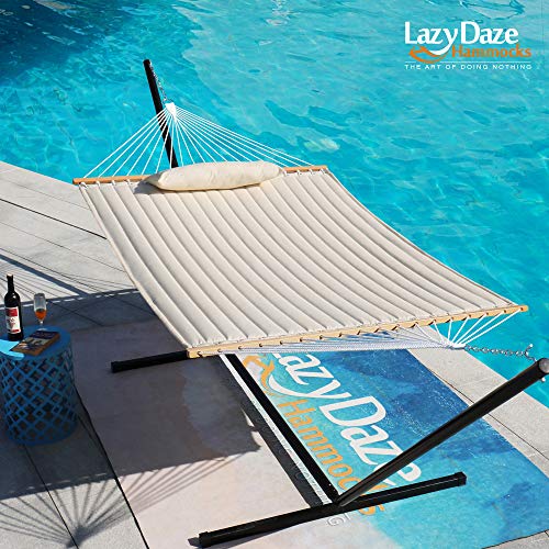 【Lazy Daze Premium Hammock】The double-layered quilted polyester with inner polyester padding and a polyethylene stuffing head pillow offer you superior comfort. 55 inches hardwood spreader bar with powder coated in an oil rubbed finish, making it more stylish and stable.Handcrafted polyester ropes add character and authenticity, and thickness of the end cords contribute greatly to the balance and strength of the hammock