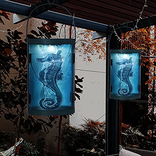 【Solar Powered Outside Lanterns】- Hanging metal and glass solar lantern feature a vivid colorful seahorse pattern,the light of solar lanterns is subtle and soft,the inside color is golden finishing.The surface is deliberately designed as an ancient effect and subtle glow lights up your patio in a special way.Great visual effects create romantic ambiance.