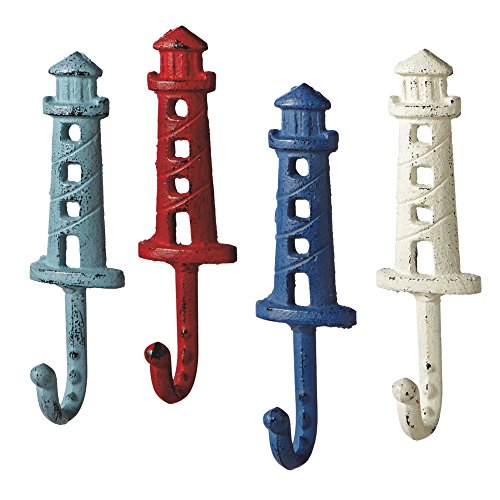 Lighthouses – Antique Style Weathered Wall Hooks Set of 4 – Aqua, Red, Blue, White
